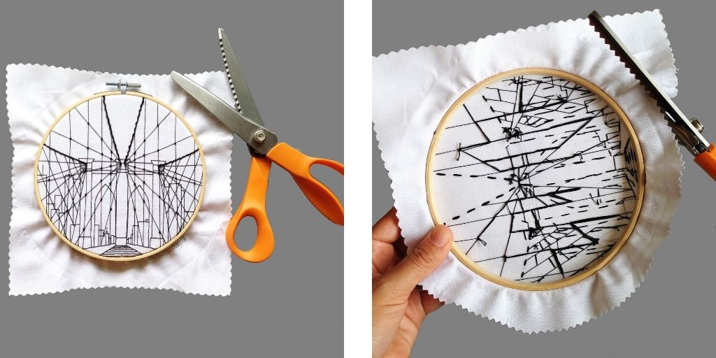 Trim the fabric about 1'' from the edge of the hoop. You can use regular fabric scissors or pinking shears (the pinking shears will help prevent your fabric from fraying.)