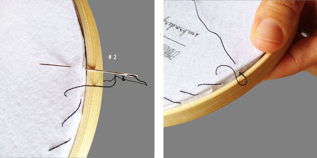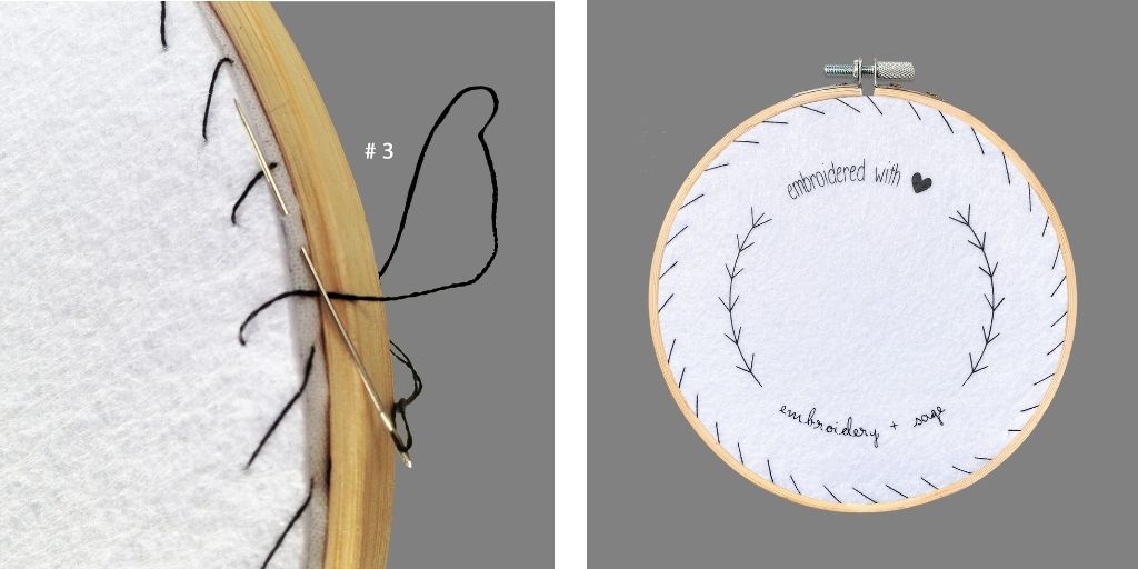 Use a whip stitch to attach your felt backing to the back of your hoop. Start with a long single strand of thread. Tie a double knot at one end of your thread, and thread the other end through the eye of your needle. Bring your needle and thread up through the back of the excess fabric (right next to the hoop's edge). Next bring your needle over about 1/2'' to the right or left. Create a straight stitch by sinking your needlepoint down through the excess fabric and back up 1/8"-1/4" from the edge of the felt (as pictured: #2). Pull your needle and thread all the way through to create a nicely angled stitch. Repeat these steps to achieve beautifully spaced whip stitches all the way around your felt.