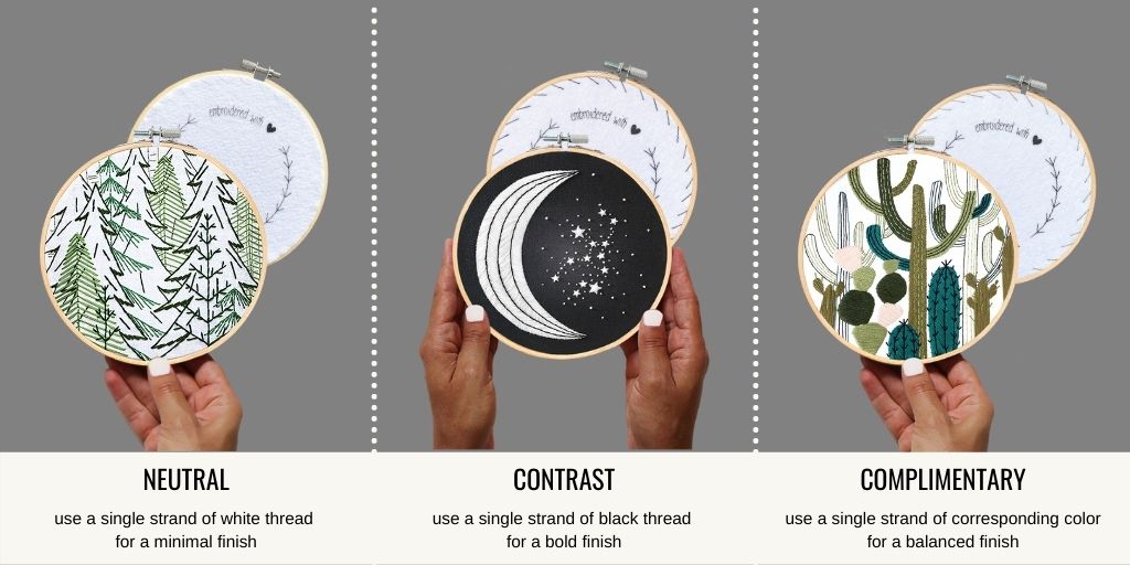 Before the felt is sewn onto the back, you need to decide on a thread color. Choose a light, dark, or corresponding thread color (from your design) to finish the back of the hoop. Below are a few examples of different color thread and the varied looks they can create.