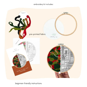 Hand stitch our Autumn in New York embroidery design. This DIY embroidery kit comes with everything you need to complete your modern needlepoint. Detailed instructions and links to video stitch-tutorials make this kit great for beginners and the experienced alike.
