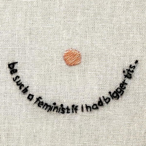Embroider this hilarious quote from the show Fleabag, written by the brilliant Phoebe Waller-Bridge—"I sometimes worry that I wouldn't be such a feminist if I had bigger tits."100% of proceeds from this pattern will be donated to Planned Parenthood.