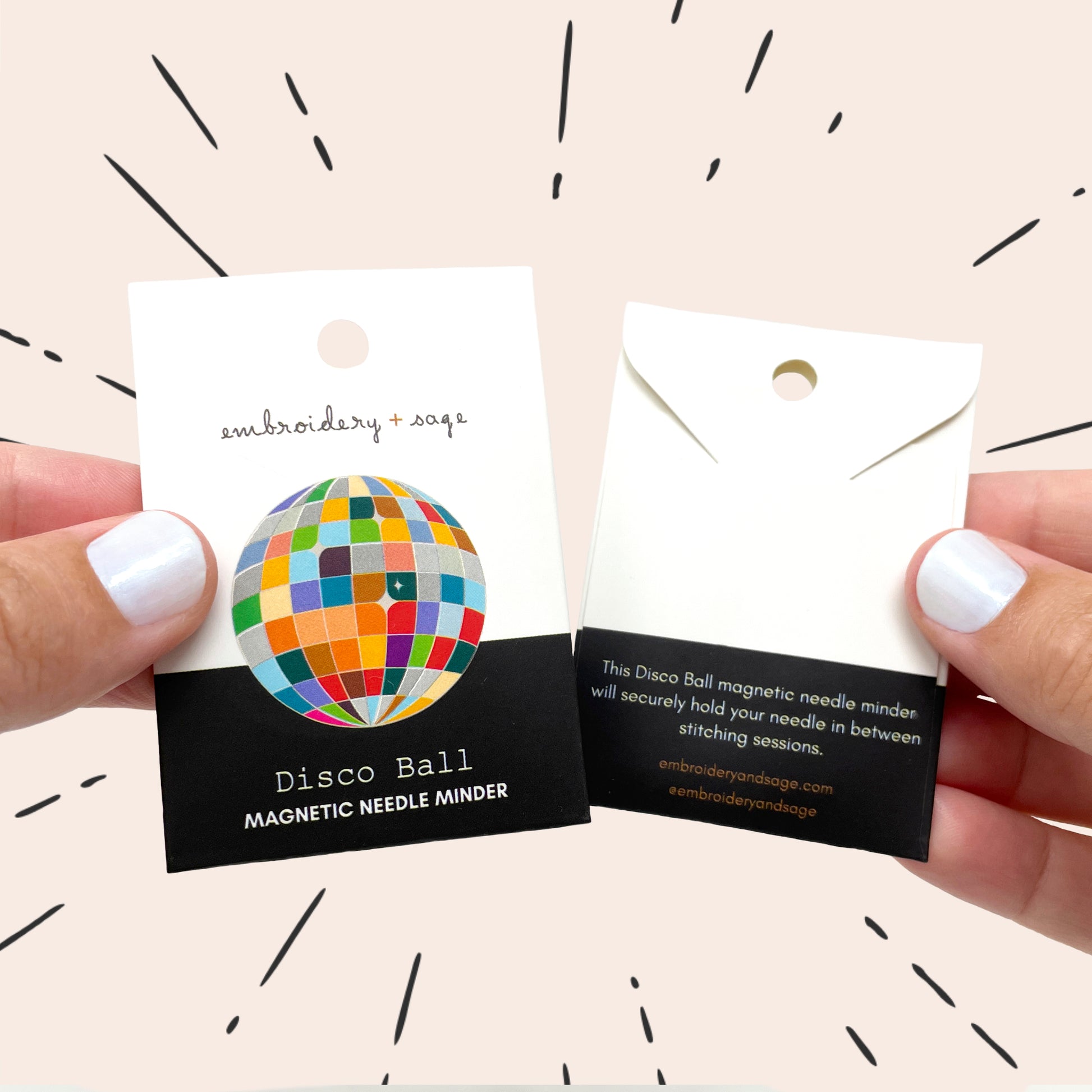 The Disco Ball needle minder will securely hold your needle in between stitching sessions. Simply place the disco ball on the front of the fabric and hold it in place with the magnet (which sits on the back side of the fabric). Place the needle on top, and voila, you have a radiant spot to mind your needle.
