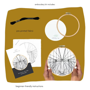 Hand stitch our popular Brooklyn Bridge embroidery design. This popular DIY embroidery kit comes with everything you need to complete your modern needlepoint. Detailed instructions and links to video stitch-tutorials make this kit great for beginners and the experienced alike.