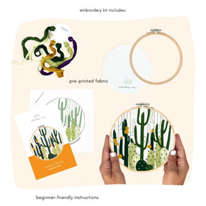 Hand stitch green cacti, prickly purple spines, and bright yellow flowers with this cheerful Cactus Bloom embroidery design. This popular DIY embroidery kit comes with everything you need to complete your modern needlepoint. Detailed instructions and links to video stitch-tutorials make this kit great for beginners and the experienced alike.