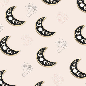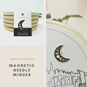 The Moon and Stars needle minder will securely hold your needle in between stitching sessions. Simply place the moon on the front of the fabric and hold it in place with the magnet (which sits on the back side of the fabric). Place the needle on top, and voila, you have a cosmic place to mind your needle.