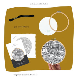 Hand embroider the Rooftops of Paris, France. This unique DIY embroidery kit comes with everything you need to complete your modern needlepoint. Detailed instructions and links to video stitch-tutorials make this kit great for beginners and the experienced alike.