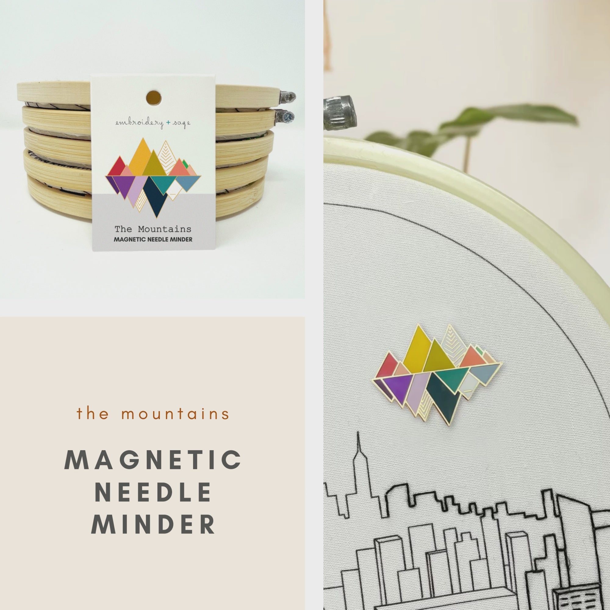 The Mountains needle minder will securely hold your needle in between stitching sessions. Simply place the reflecting mountains on the front of the fabric and hold it in place with the magnet (which sits on the back side of the fabric). Place the needle on top, and voila, you have a majestic spot to mind your needle.